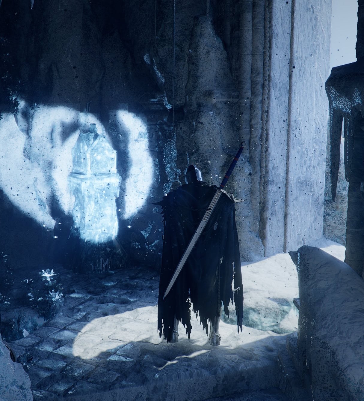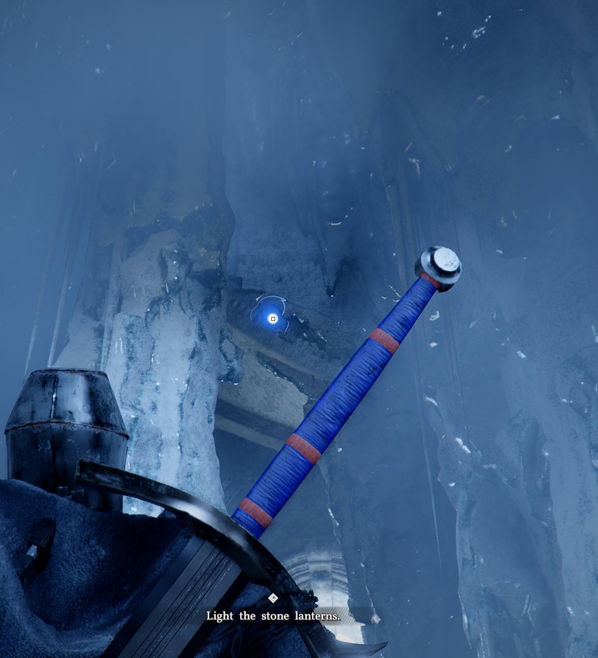The first stone lantern will be found at the entrance. It’s frozen in place, break it free with Turning Slash. Alternatively, let a falling chunk of ice land on it to break it. Once free, walk up to it and turn it on. This will open the front door to the spire and let you inside.