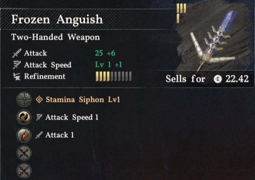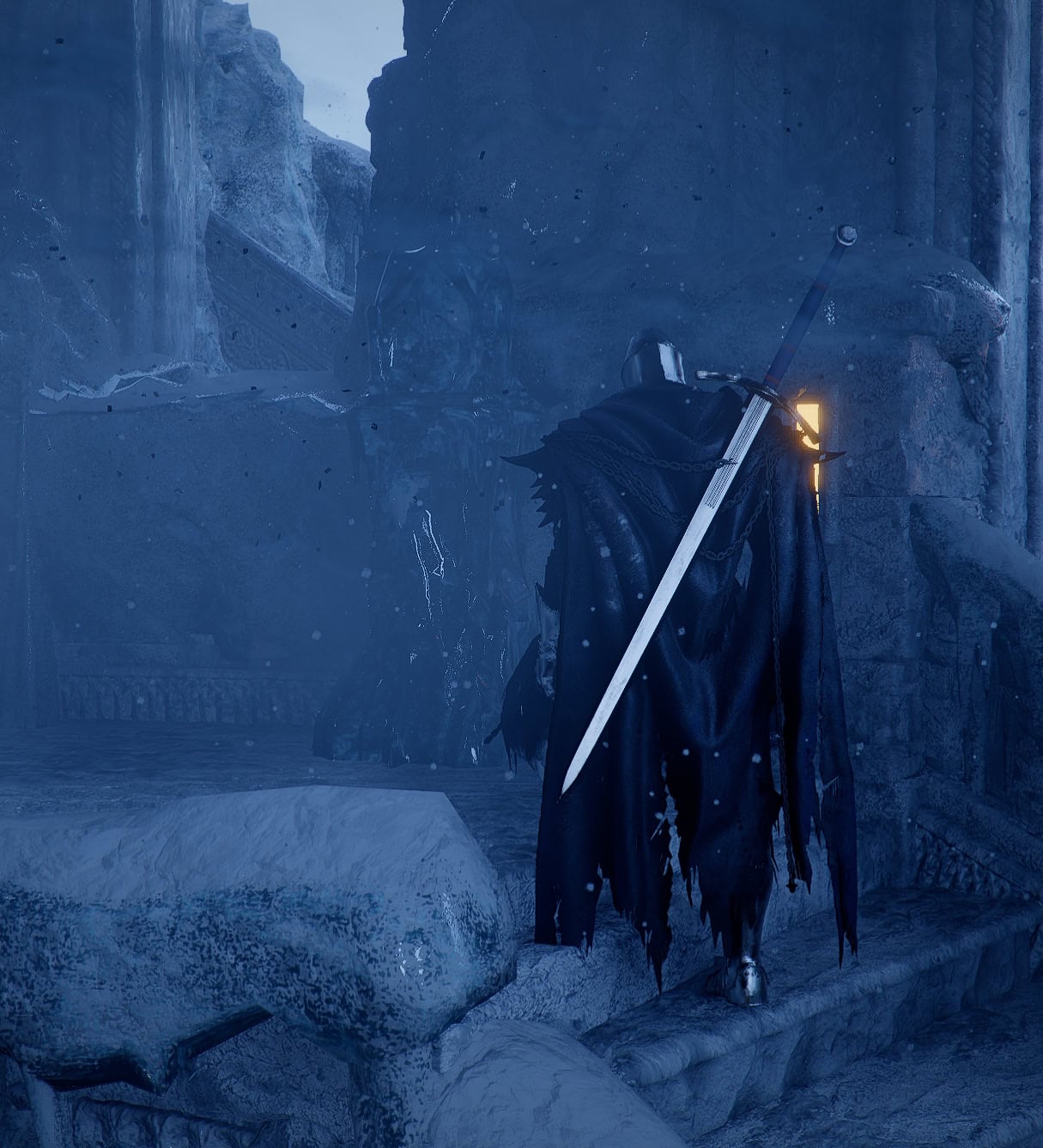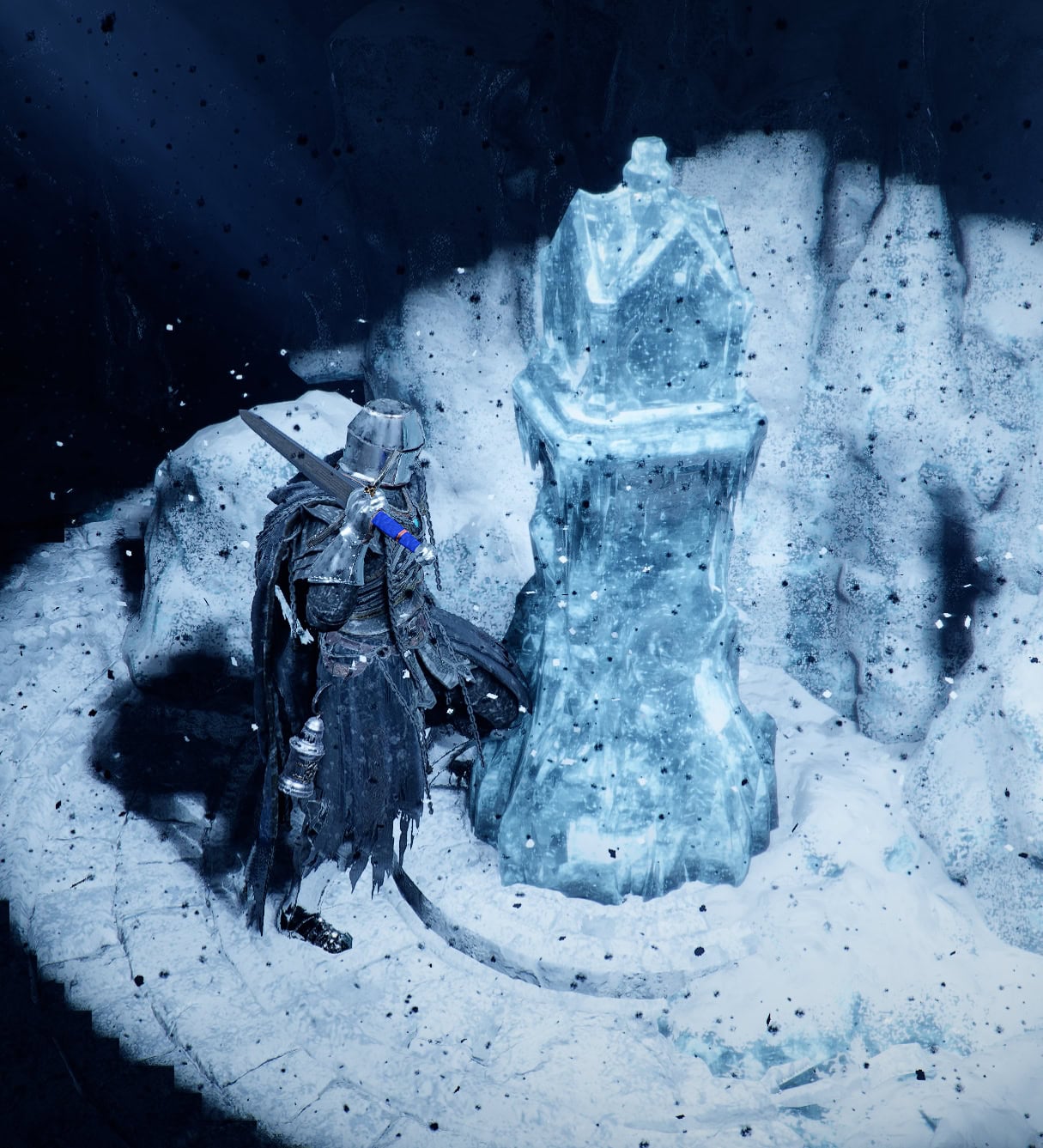 Underneath the set of spiraling stairs is a Treasure Chest containing the Frozen Anguish Longsword and a Refined Palmar Pill. This is the same sword that the Skull Knight uses.