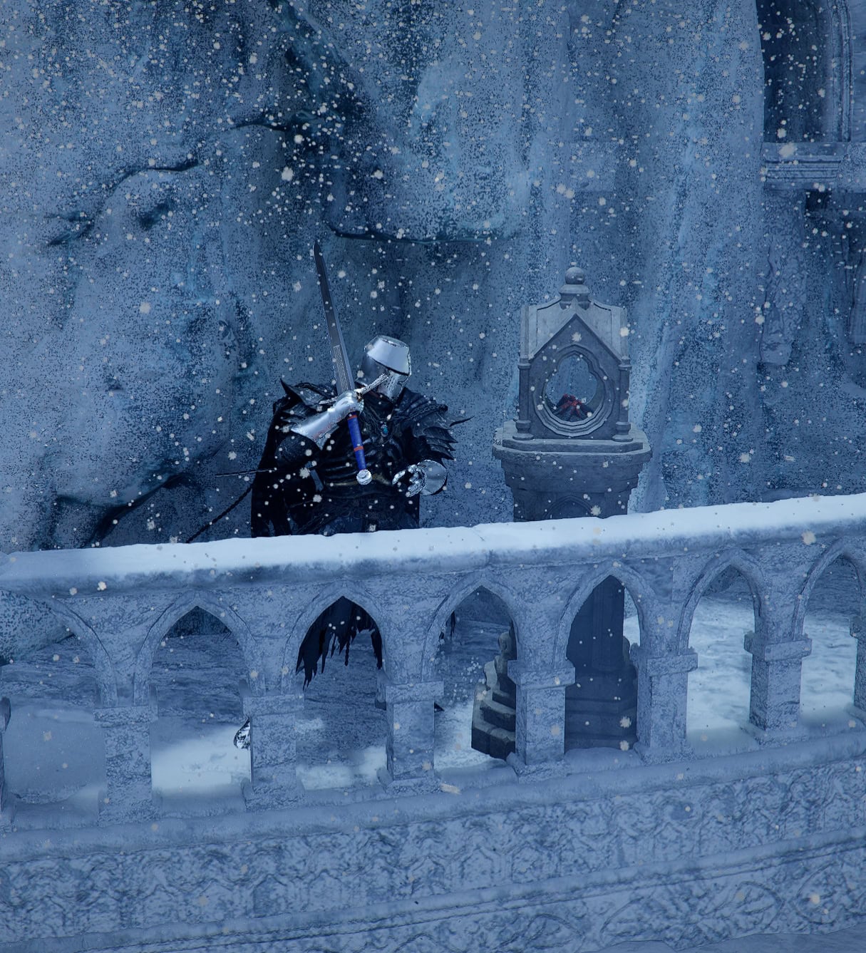 The Skull Knight will appear on the frozen lake and attack you when you reach certain zones. He teleports to attack from behind, so use your shield to block his attacks. After losing some HP, he’ll disappear and respawn somewhere else at full health