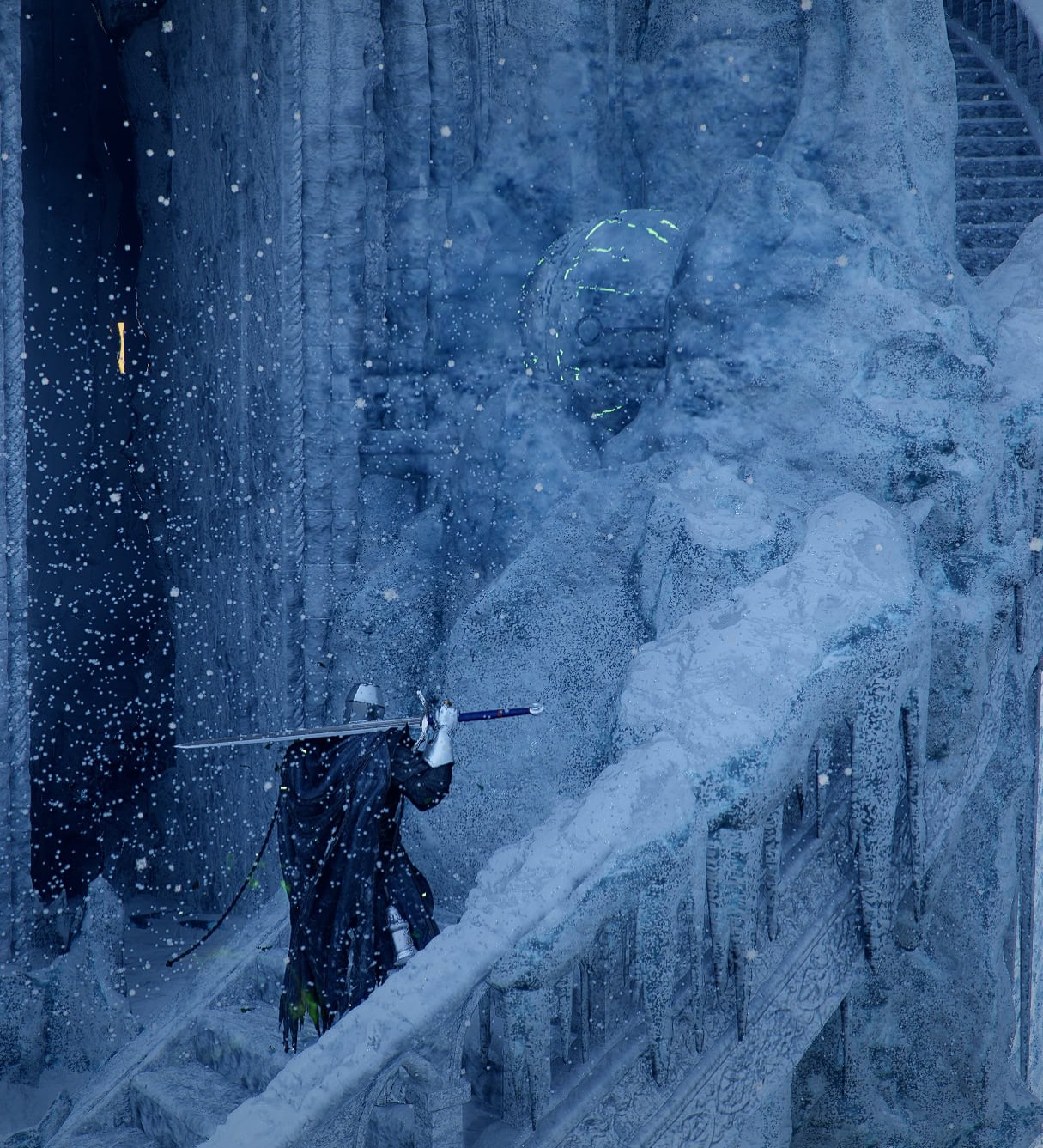 As you go upstairs, the path will be blocked by ice. You’ll need to use the Axiom Force’s Aerial Maneuver to continue ascending. Do this twice to pass both obstacles, and you’ll find the third stone lantern when you continue up the stairs.