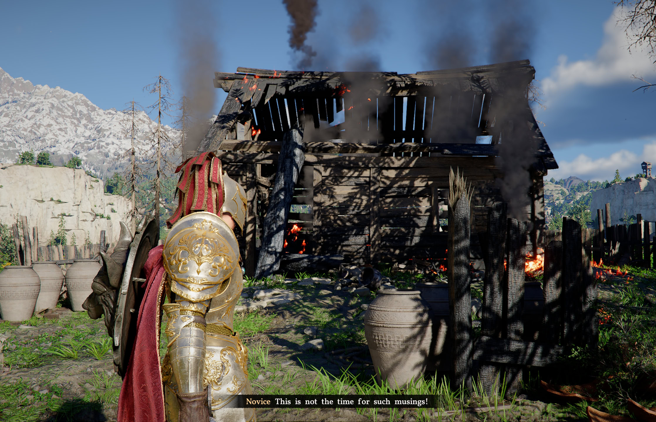 Upon leaving, you’ll overhear of a healer in a nearby village being threatened, so you’ll offer to help them. Upon arrival, you find the house set ablaze with someone trapped inside. After rescuing the man, you are told that the healer was taken by the bandits, and you set off to rescue him.