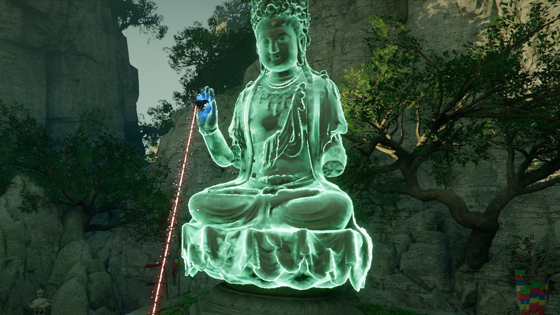 Upon visiting the first statue, a scene will play out where you are confronted by a mysterious monk wearing a mask. After this scene, he will leave, and you can repair the statue with Axiom Force and Force Palm.