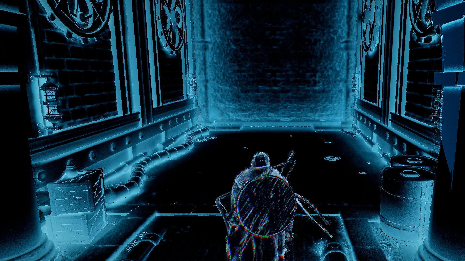 After activating the first Visione, head through the door to the left and continue through the series of doors until you reach a dead end. End the Visione and walk through the now accessible door to the next room. Here, you’ll need to re-enter the Visione using the Visione Information Input Device in the corner near the broken stairs. Head up the stairs and follow the series of doors to the right, going in and out of Visione as needed.