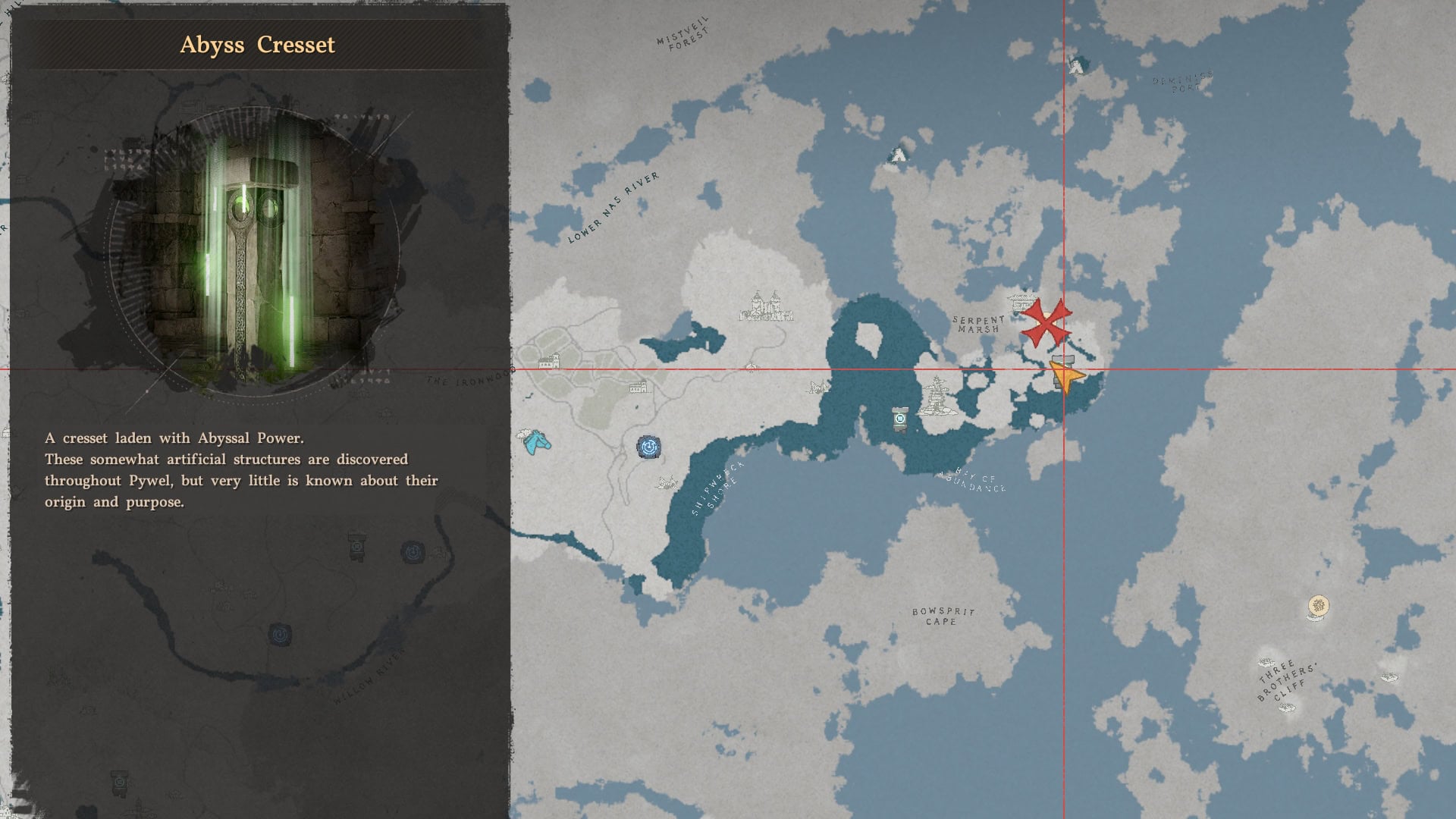 You can find an Abyss Cresset in a cavern on a tiny island along the coast south of Bowspirit Cape, east of the Steel Mountains.