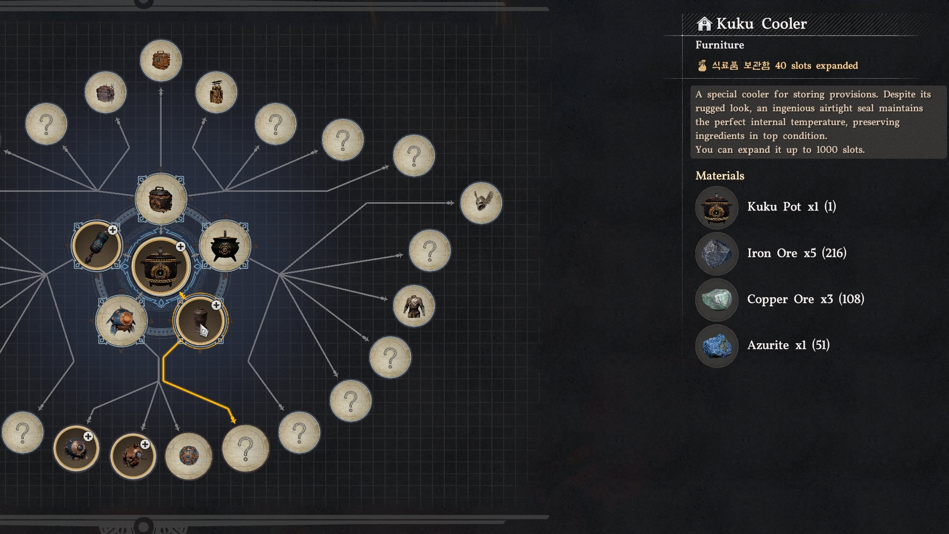 While the default Basic Kuku Cooler only has a meager 50 slots of space to work with, the Enhanced Kuku Cooler offers much more storage for the late game, but also takes a bit of effort to gather the required materials.