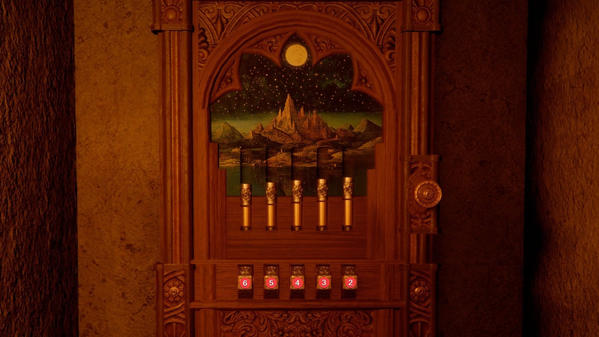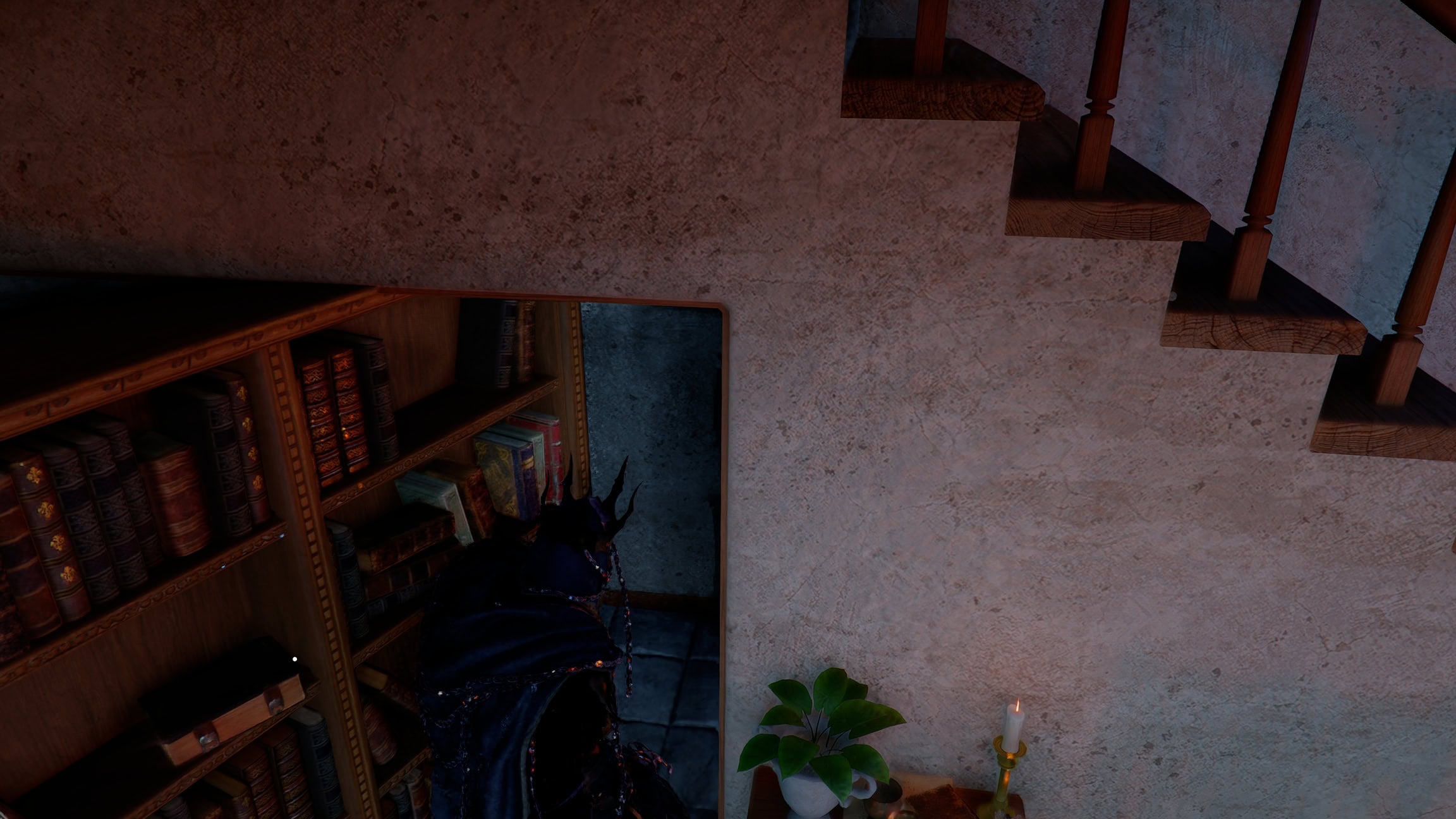 Just walk into the bookshelf beneath the staircase on the main level and you’ll automatically push through. Light the sconces when you enter. It’s dark inside.